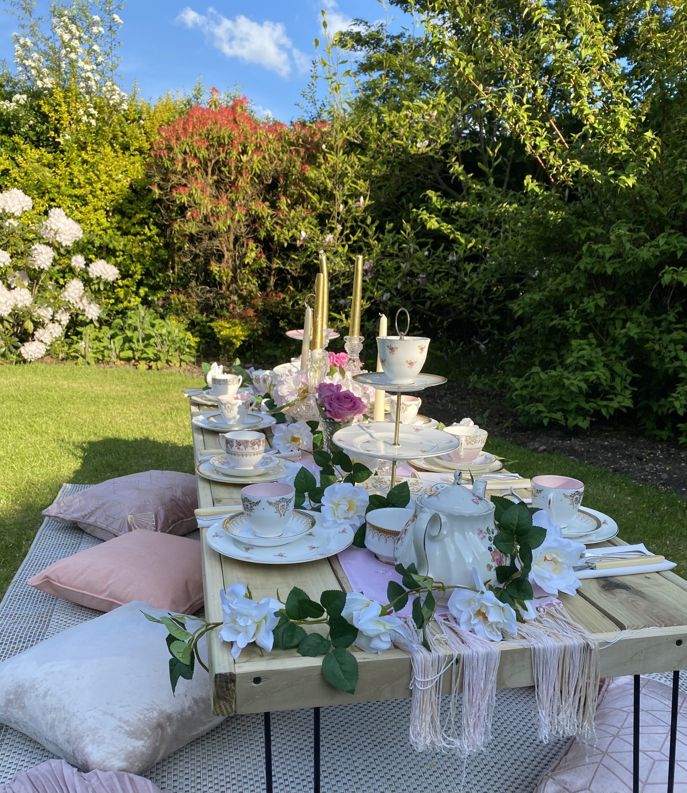 Host a beautiful day time or evening time gathering with our vintage china hire and Luxe Picnic outdoor furniture for garden parties. Our collection includes floral teapots, dainty plates, milk jugs, and elegant glassware—perfect for al fresco dining, summer teas, or casual celebrations with friends. Let your garden party stand out with vintage style.